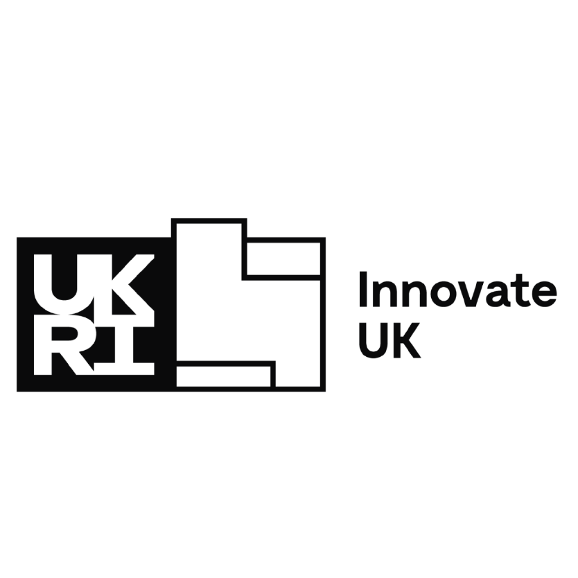 Black and white logo with the outline of a building and the text 'UKRI' inside the outline, and 'Innovate UK' to the right.