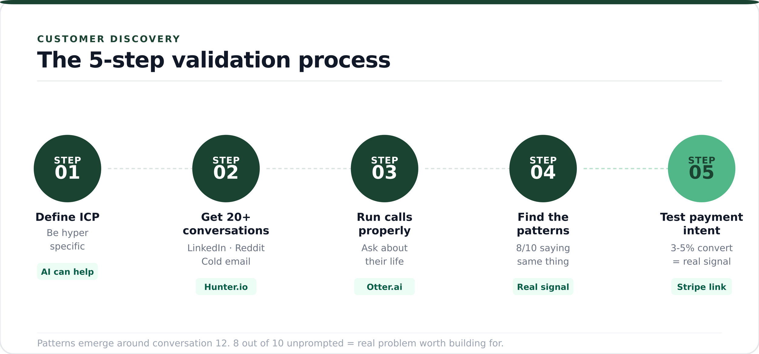 Step 2: Get the conversations. Aim for at least 20 before drawing conclusions. Find people through LinkedIn, relevant Reddit threads, Slack and Discord communities, and cold email using Hunter.io to find addresses. Keep the message under 60 words and ask only for 20 minutes.