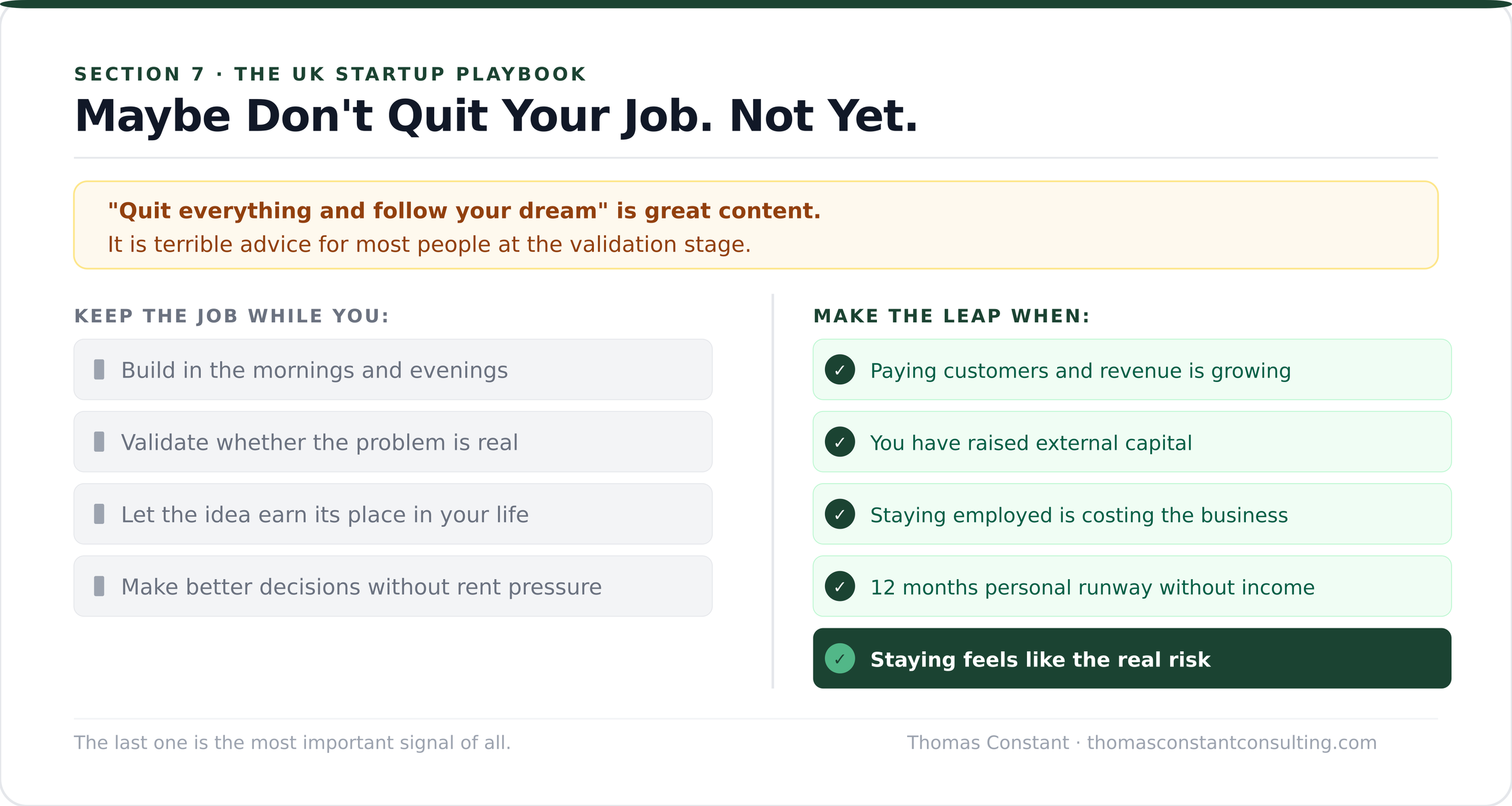 The "quit everything and follow your dream" narrative is great content. It is terrible advice for most people at the validation stage. Unless you have six months of personal runway, revenue already coming in, or someone else's money in the bank, keep the income. Build in the mornings. Build in the evenings. Let the idea earn its place before it takes over your life.