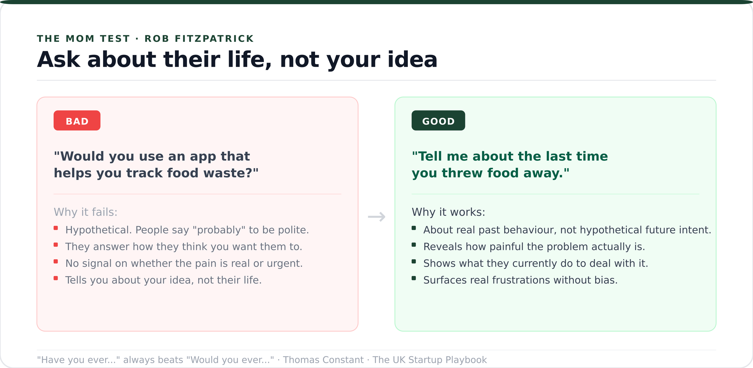 Rob Fitzpatrick wrote a short, brilliant book called The Mom Test. The entire premise: if you ask your mum whether your business idea is good, she will say yes. Not because it is, but because she loves you. Stop asking about your idea, and start asking about their life.