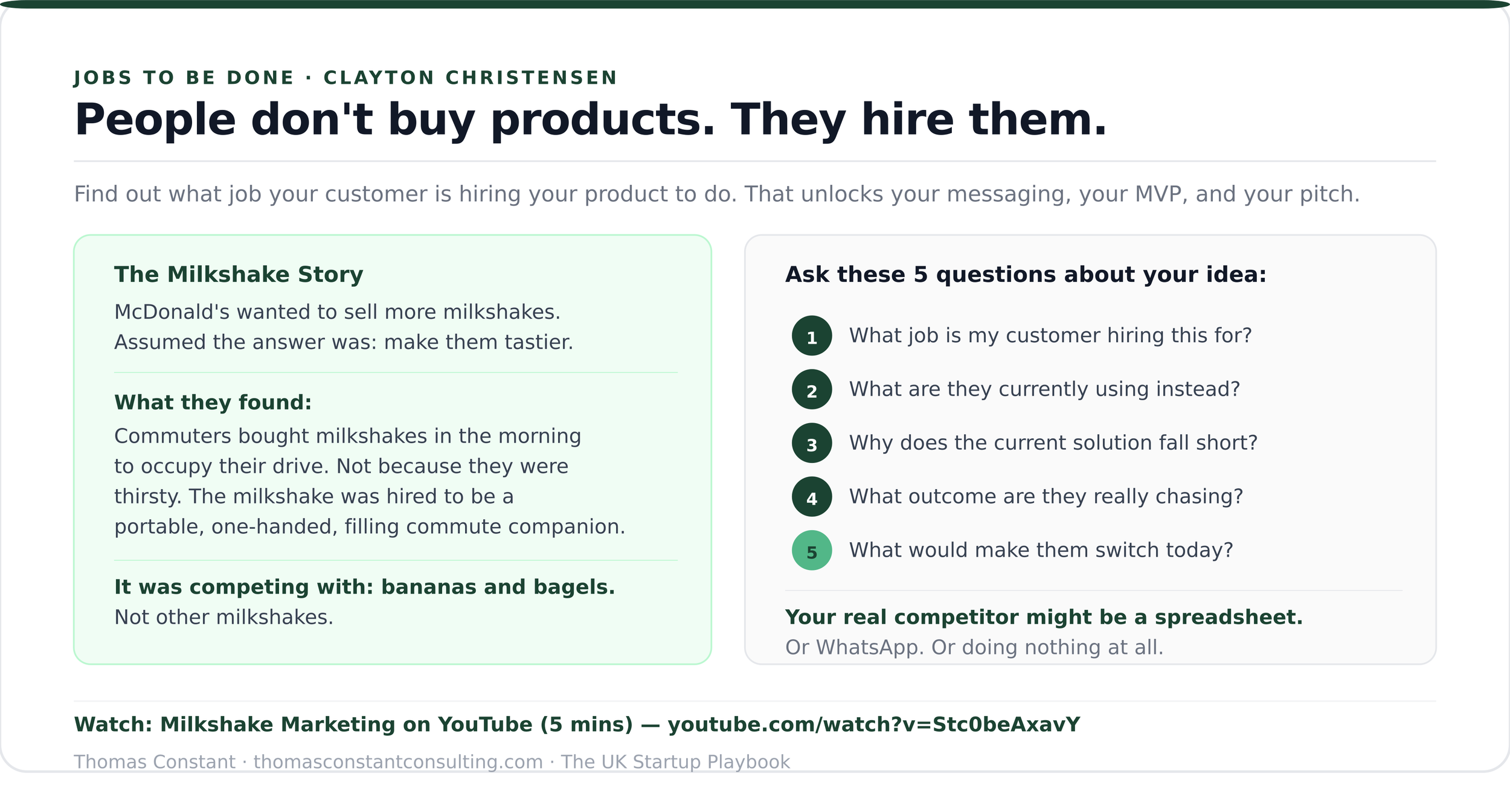 Clayton Christensen's Jobs To Be Done framework is worth understanding here. People do not buy products. They hire them to get a job done in their life. Once you understand the real job, your messaging, your MVP, and your sales pitch all become much clearer.