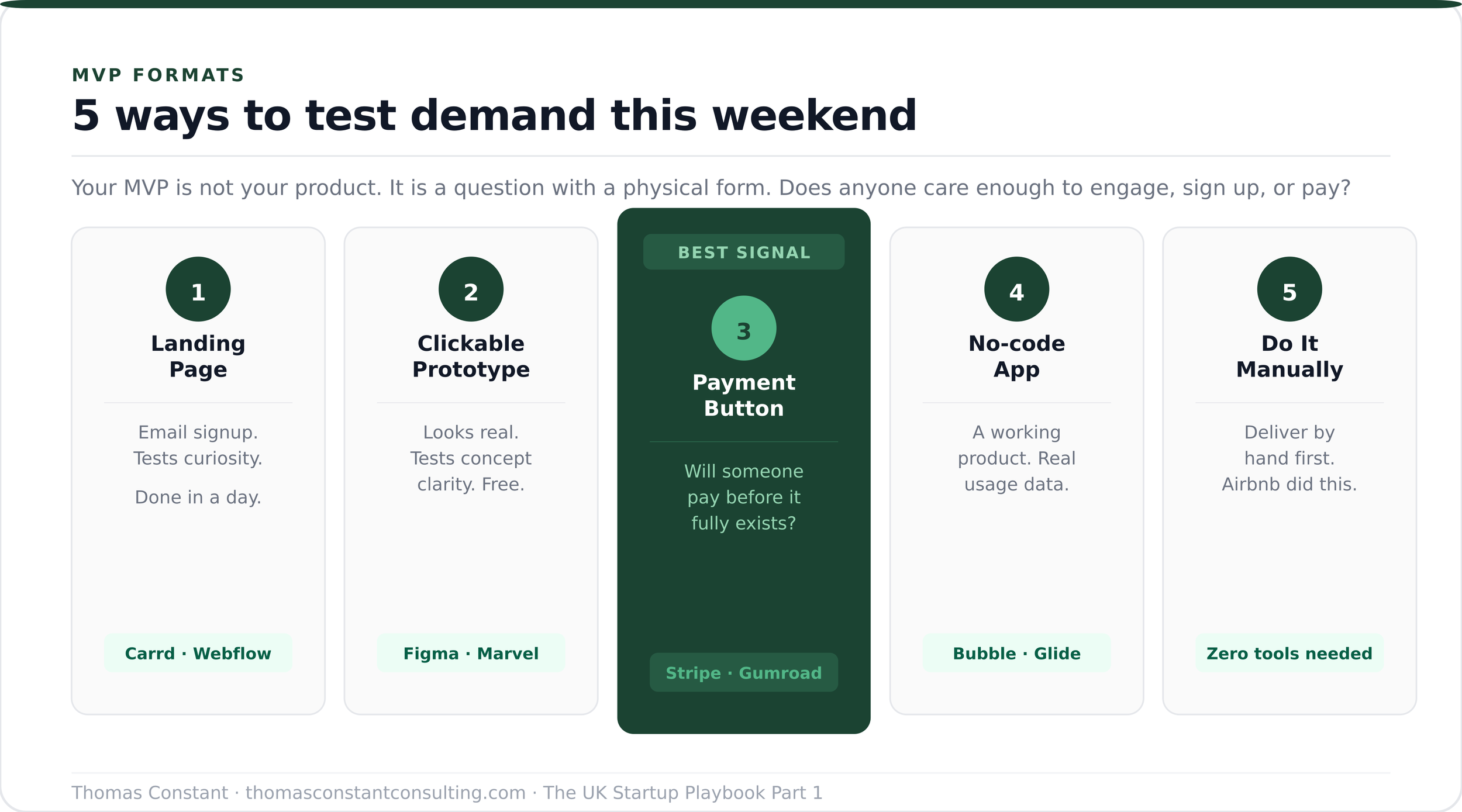 Your MVP is not your product. It is a question with a physical form. The question: does anyone care enough to engage, sign up, or pay? Everything else is a guess until you answer that.